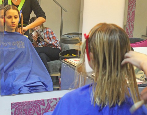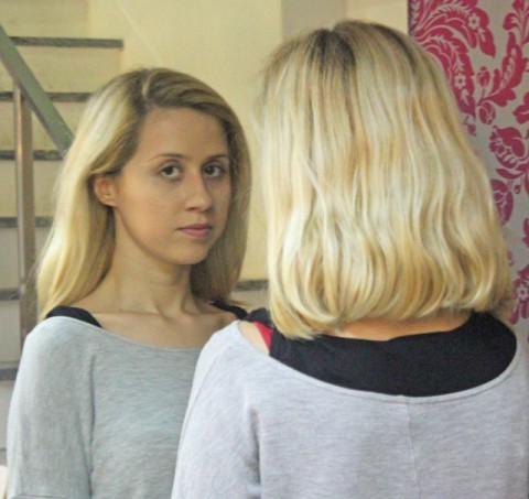 She has a fabulous blonde hair in a sexy bob style. Visiting the hair salon, her shampoo was kept for our cameras. Dont miss it!