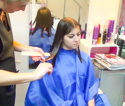 She is wonderful young woman arrived to the hair salon wearing a long ponytail. She wanted a haircut for Summer and the stylist chose a straight bob with hair touching her shoulders and sexy bangs worked with razor blade. The result is amazing. The clip includs also a sexy shampoo and a detailed hair drying.