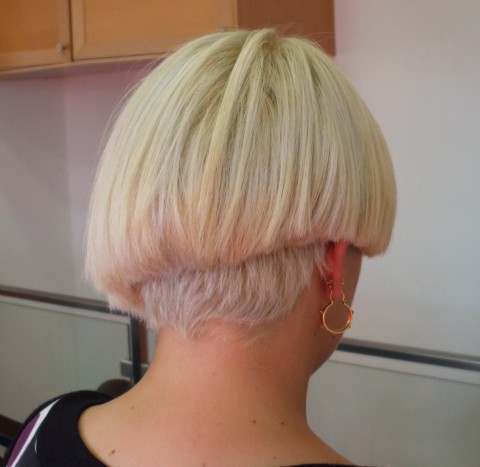 Raquel love extreme cuts. She is always changing her hair looking all the time for new and extreme looks. This time she sat down in the barber chair of salon STROM and receveid from Rute an assymetric bob with right side and nape raized, hair longer in the left side and bangs. Her blonde and almost white hair make Raquel´s look amaizing. The video is fantastic!
