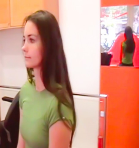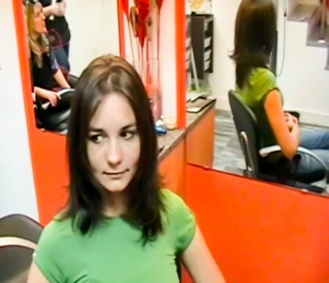 She is a girl with a beautiful dark hair. Tired of her very long straight style she decided to try a change for a more modern haircut. The stylist chose a medium/short haircut very layered and her gentle face become brighter. Including a very foamy shampoo and a detailed hand hair drying, this clip is a piece of life in hair salon.