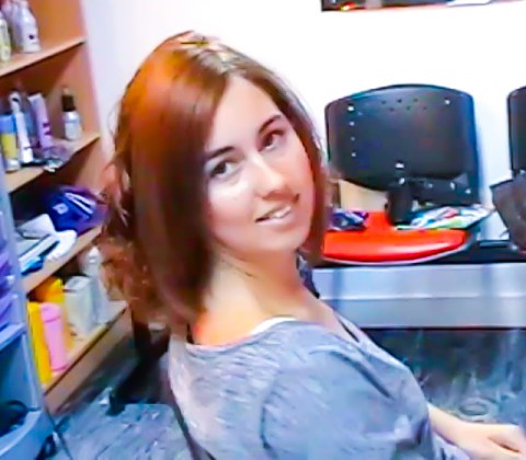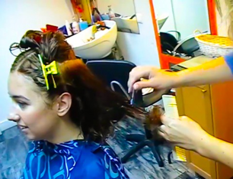 Her hair is naturally curled and strong in a red color stressing her sexy green eyes. The color needs a retouch and she decided that its also a chance to replace her very long style by a shorter and sexy haircut. So, this clip its about it: a huge transformation starting for a first dry haircut, going to painting in a new red, than a pampered shampoo, the haircut with razor blade and drying and styling. What a gorgeous transformation than you can watch in all details.